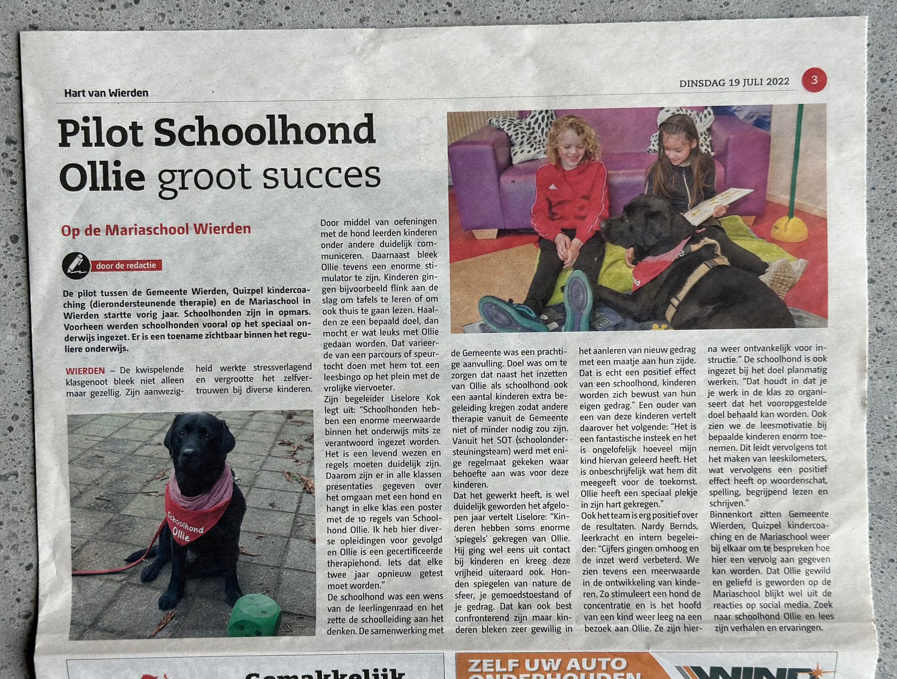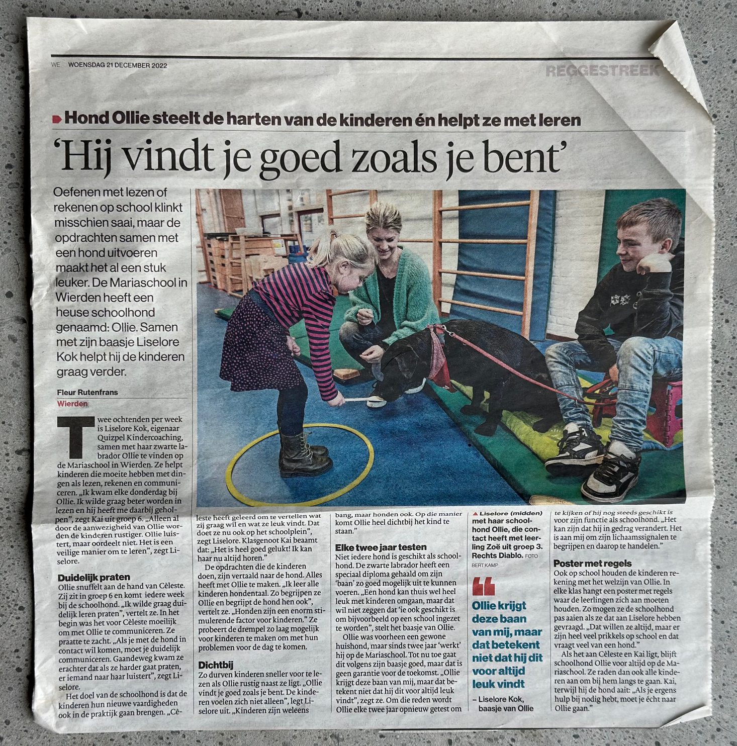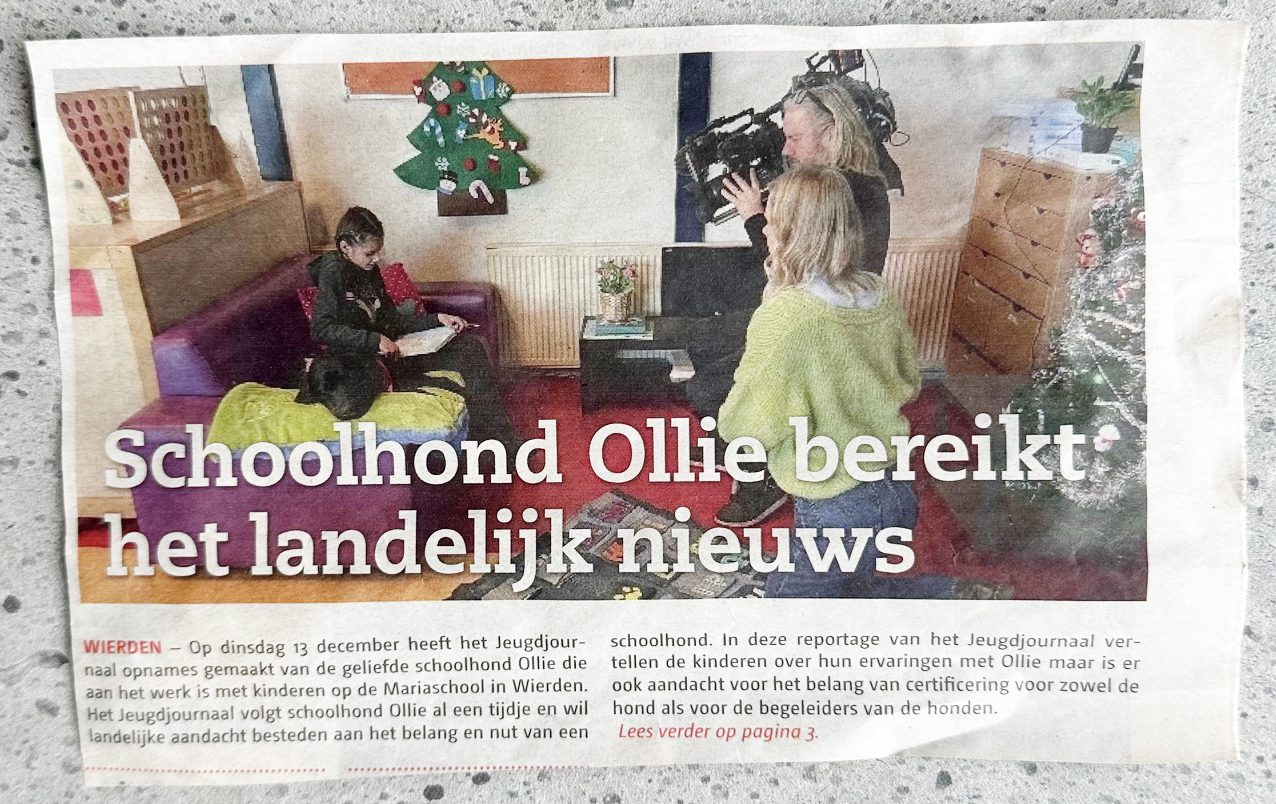 Ook het werk van schoolhond Ollie bleef niet ongezien. Hij werd, samen met zijn baasje Liselore, een ochtend gevolgd door het Jeugdjournaal. Ook journalisten wisten hun weg te vinden naar zowel Liselore en Ollie als Erna en Pieter bij hun zoektocht naar meer informatie over de verantwoorde inzet van een therapiehond binnen coaching, therapie of op school.